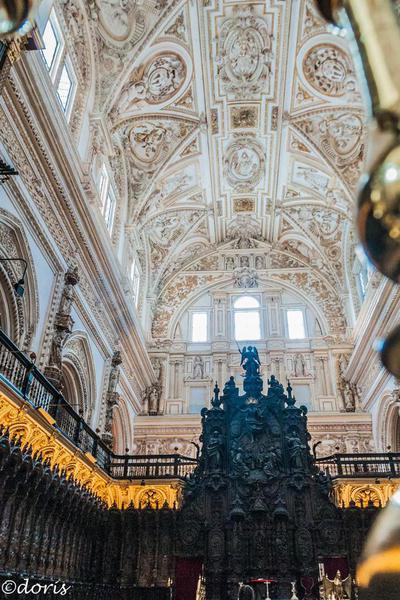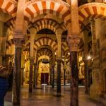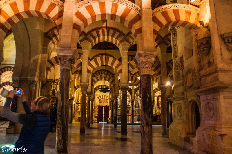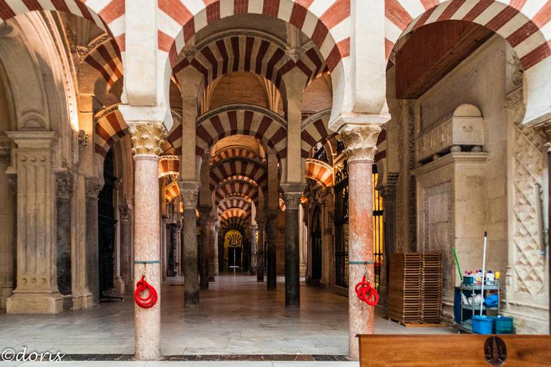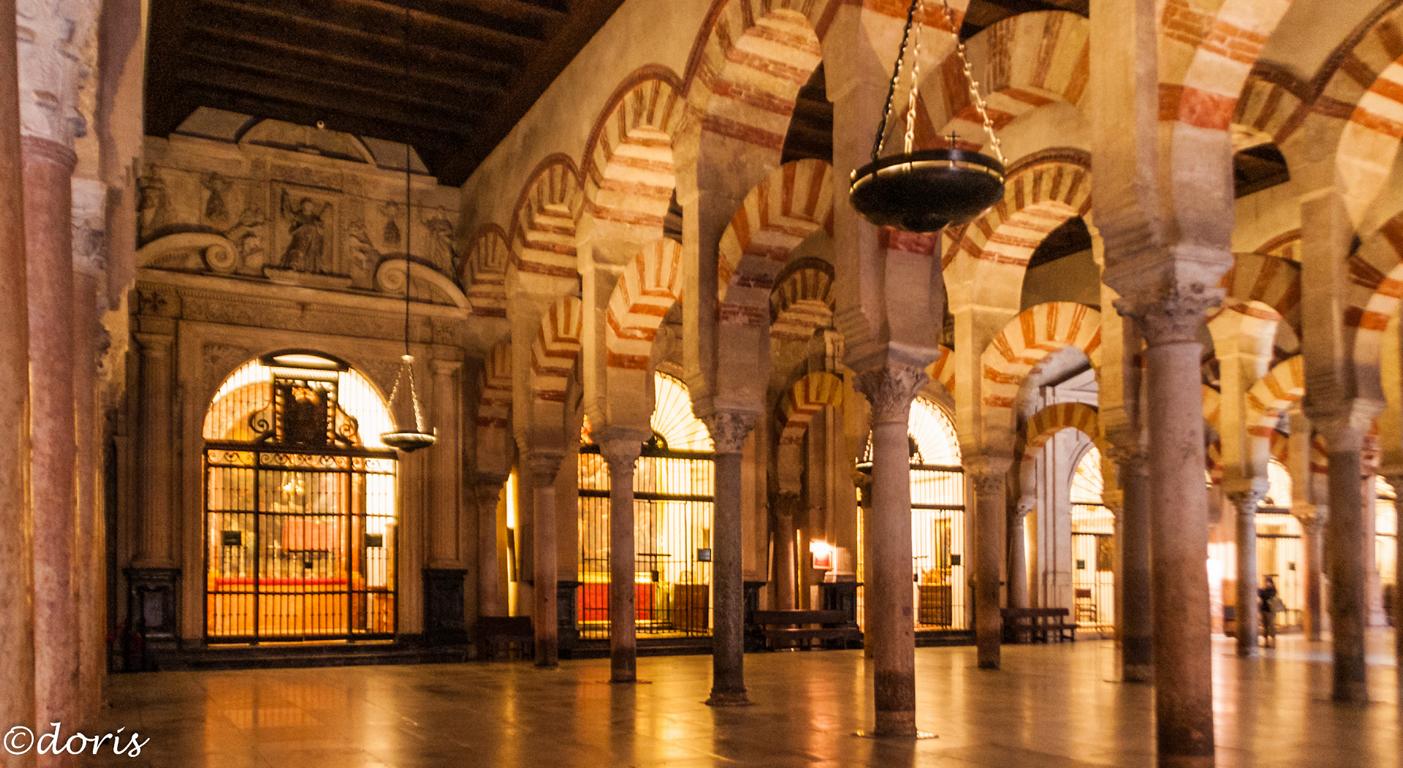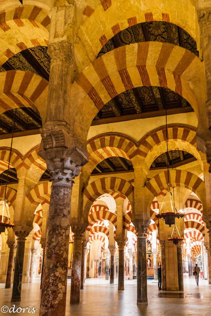 Tritt man nach dem Durchqueren des weitläufigen Orangenhofs durch das Palmentor ins Innere der Mesquita, versinkt der Blick in einem steinernen Zauberwald, in dem sich Säulen hinter Säulen reihen, Bögen über Bögen türmen. 856 Säulen aus verschieden getöntem Marmor, Japsis und Granit eröffnen stets wechselnde Durchblicke und die rot-weiss gestreiften Hufeisen- und Rundbögen versetzen das Ganze in eine rhythmische Schwingung. Die Krönung aber bildet die Lichtkuppel über dem Flechtwerk gewölbter Rippen. Eine architektonische Glanzleistund, die damals ohne Vorbild war.
